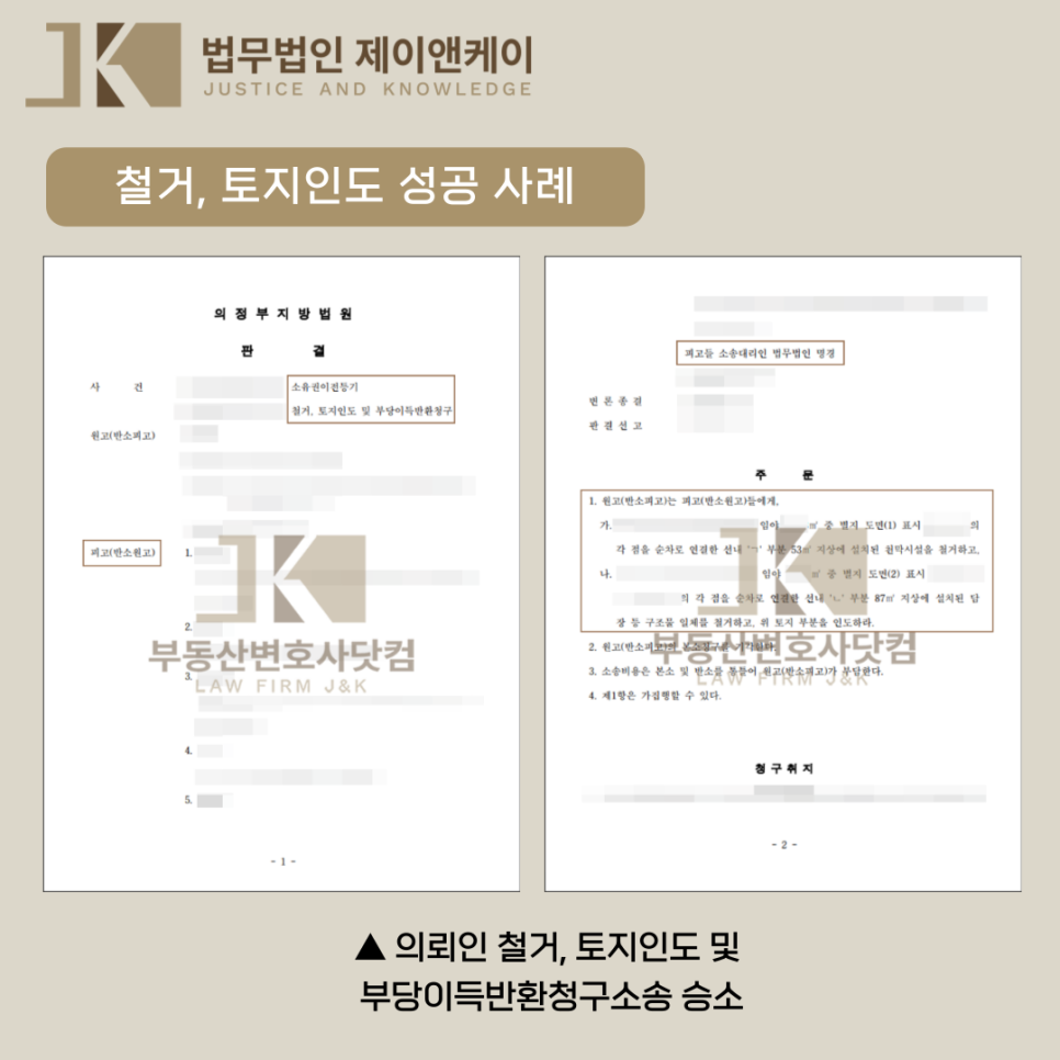 법무법인 제이앤케이(J&K) (부동산변호사닷컴)는 부동산 특화 로펌으로 각각의 전담팀을 꾸려 운영하고 있으니 건물철거소송 토지인도청구소송 관련해서 도움이 필요하시면 문의하시기 바랍니다.
